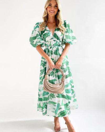 Abito Midi Fantasia con Maniche a Sbuffo e Scollo a V