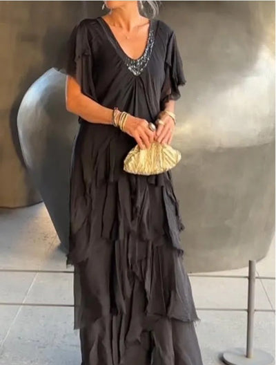 Adele - Abito Lungo in Voile con Strati e Scollatura Luminoso
