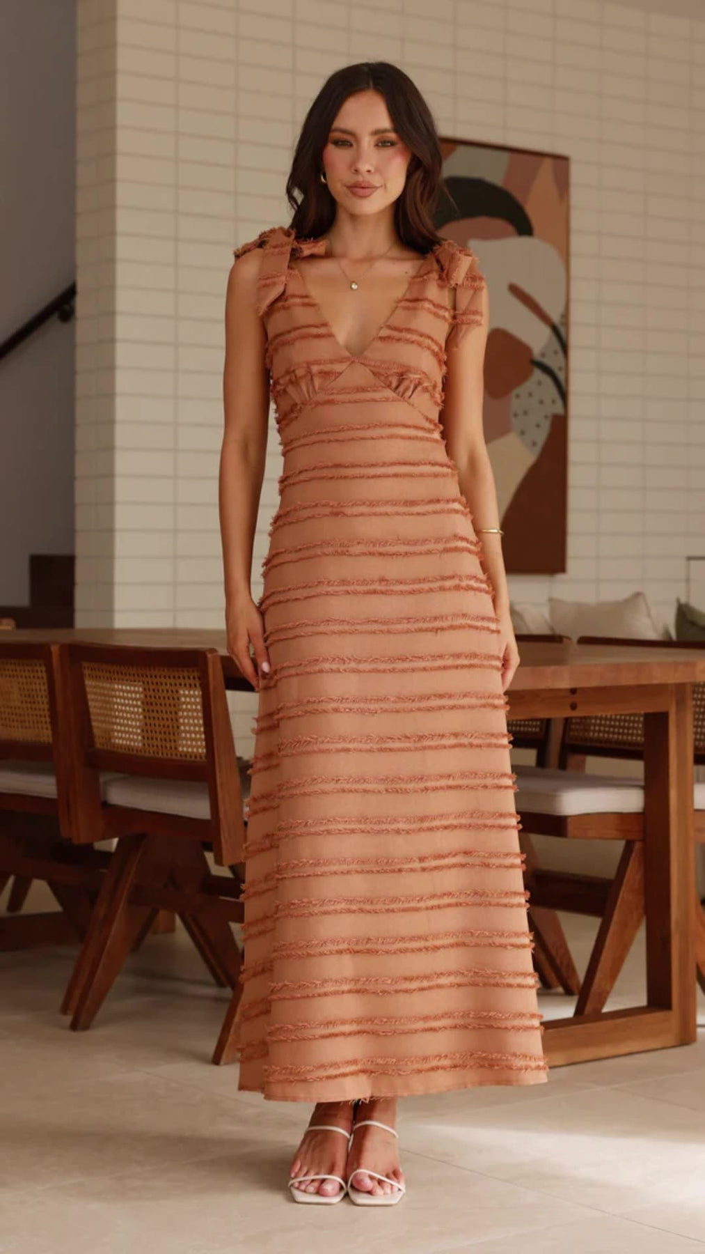 Scopri l'eleganza di questo abito lungo, caratterizzato da una texture raffinata e delicati volant. Le spalline con fiocco aggiungono un tocco femminile, rendendolo perfetto per ogni occasione.